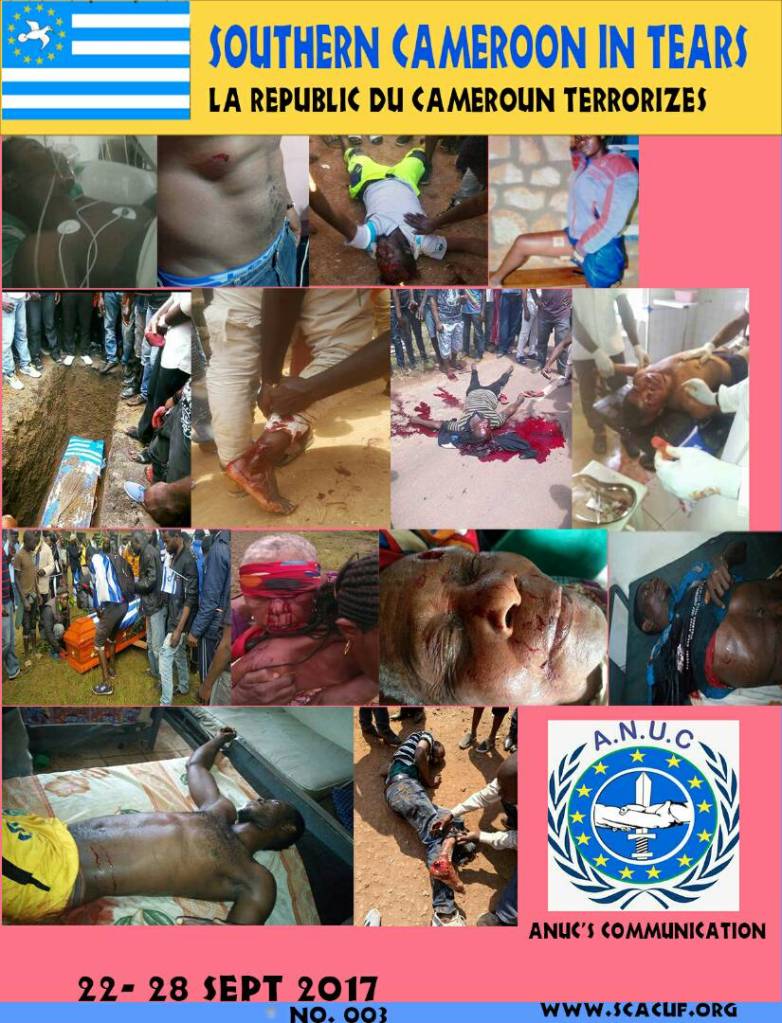 The genocide gathered steam in 2017, as the French Republic of Cameroun deployed more hard ware into the British Southern Cameroons. Weapons earlier donated to fight Boko Haram in the north of the country found themselves into the territory. The French Cameroon appointed governors instituted more repressive measures. Peaceful demonstrations were increasingly becoming deathly. The territory was becoming the “killing Fields” of British Southern Cameroon. As the repression continued, citizens of the territory began asking themselves why they were being treated differently as demonstrations by teachers and other civil servants in French Cameroun were not met with similar high-handedness. To put it in historical terms, there was a Re-awakening in the British Southern Cameroons let by a vibrant diaspora. The outcome was a general demonstration all over the territory by its citizens with green tree branches (as a sign of peace), on 22 September, 2017, and 1st October, 2017. Their chant in addition to “Let my people go” was “No Violence”. However, as inferior humans or dogs as the French colonial governor calls them, the Police, French para-military – Gerdames, Biya’s personal military – the BIR, undercover officers and regular armies unloaded their magazines on the innocent civilians. The results were chilling.Many were killed indiscriminately. Below are some of the victims killed.No independent investigation has ever been done. Another abandonment by the global community and thus an message to the French-Cameroun authorities that British Cameroonians were worthless, filth good for the dump. The green light for a full-scale genocide was given by the world.The only credible investigation so far conducted on the killings on these days has been that pf former opposition Social Democratic Front (S.D.F) Party, Mr. Wirba Joseph. He states:122 KILLED, 150 MISSING AND AROUND 2000 DELIBERATELY MAIMED (HON. WIRBA).