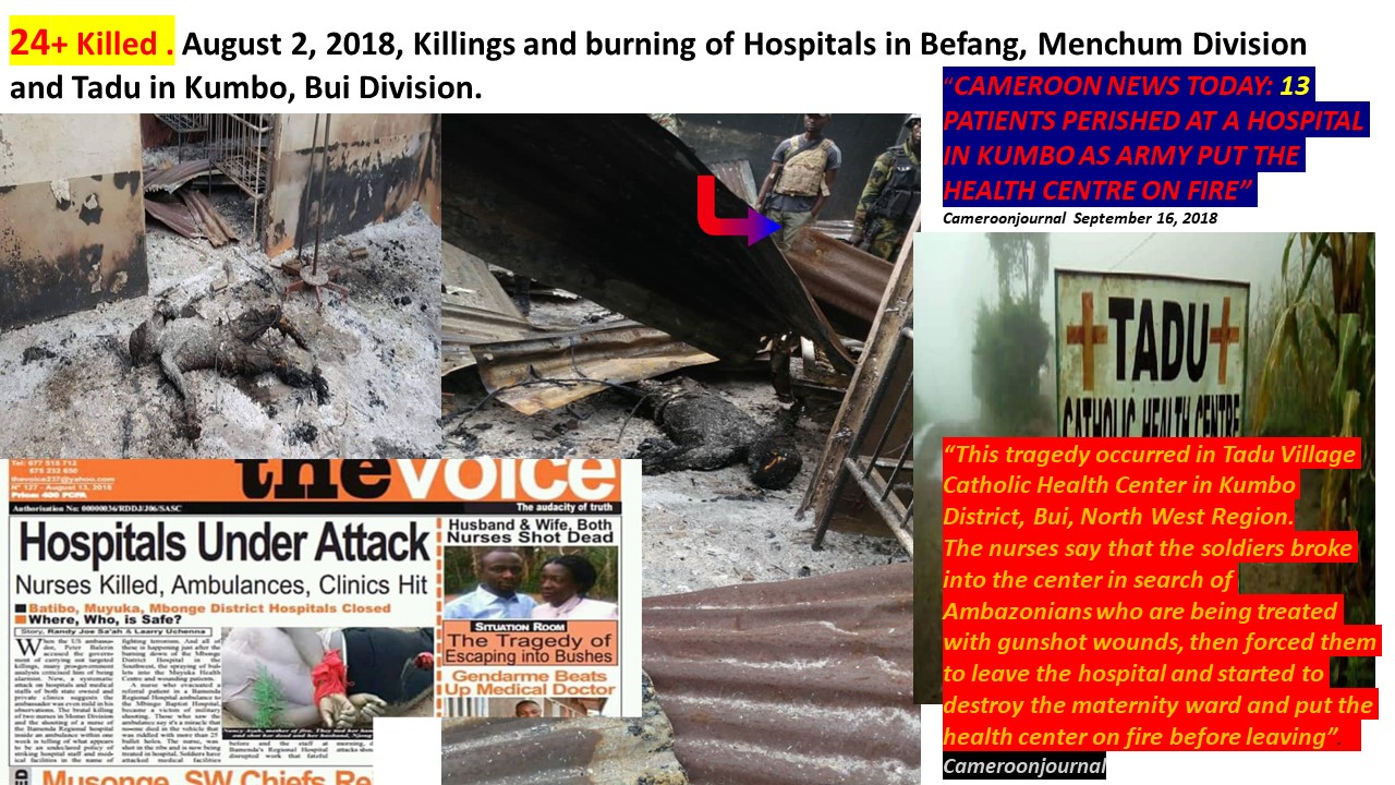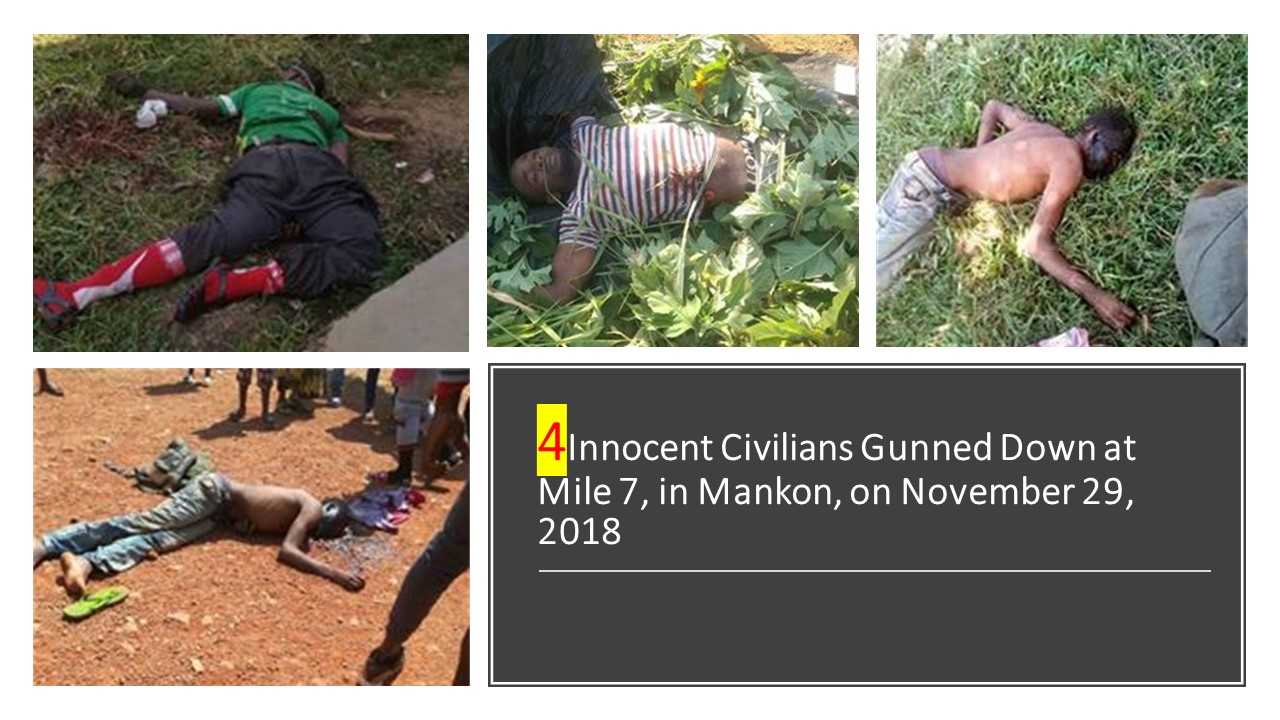 About two weeks after the Donga-Mantung massacre was the turn of the quiet village of Babessi on the 12 of October, 2018. While the Babessi massacre were less in number than Bafut, Wum, Mamfe and other areas, the uniqueness was in its savagery. In addition to executing them in front of their families, the French Cameroun soldiers equally set the bodies ablaze. This torching of bodies was the new modus operandi or official genocide strategy of the French Cameroun government on the minority English-speaking people. It continues till date with no repercussions.