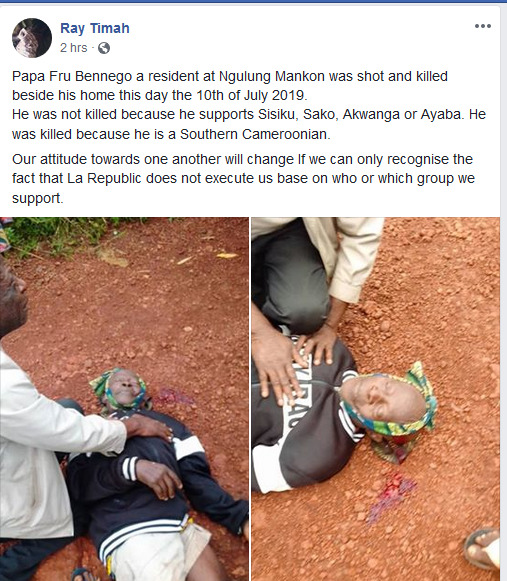 It should be noted that, despite his robust support for the French Cameroun military, the same military has wrecked havoc in the Fon’s fondom. The Village of Alaachu was completely burnt by the French Cameroun military on 16 May, 2019, to the cowardice of the Fon who raised no protest. Several livestock were also killed by the military. The latest gruesome killing in the Fondom was a 24-year-old Nurse Carine and her sister shot point blank by the military, when Carine and sister made the mistake of identifying themselves as Anglophones. The French Cameroun military are often selective in their killings. French speakers have been spared, while English speakers have been selectively shot.