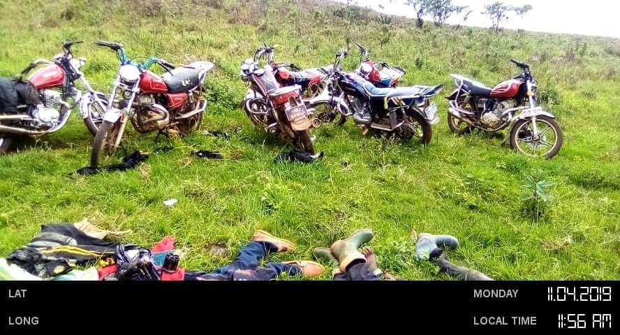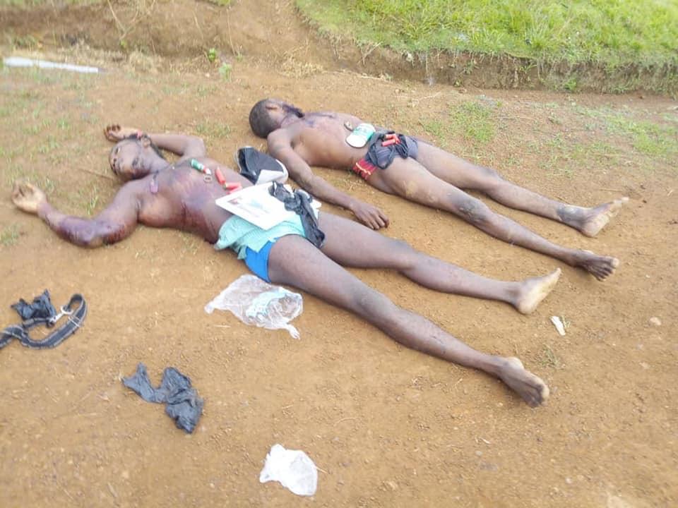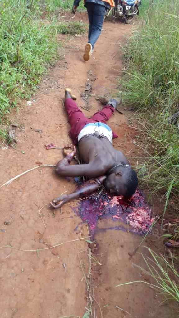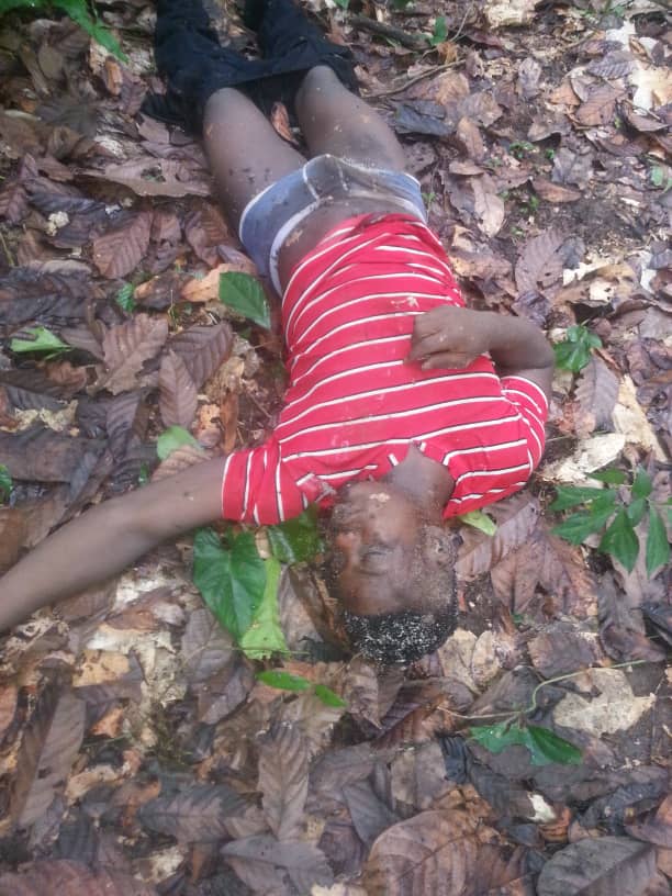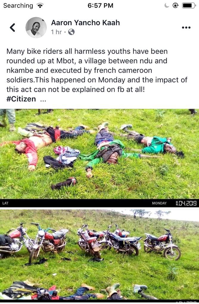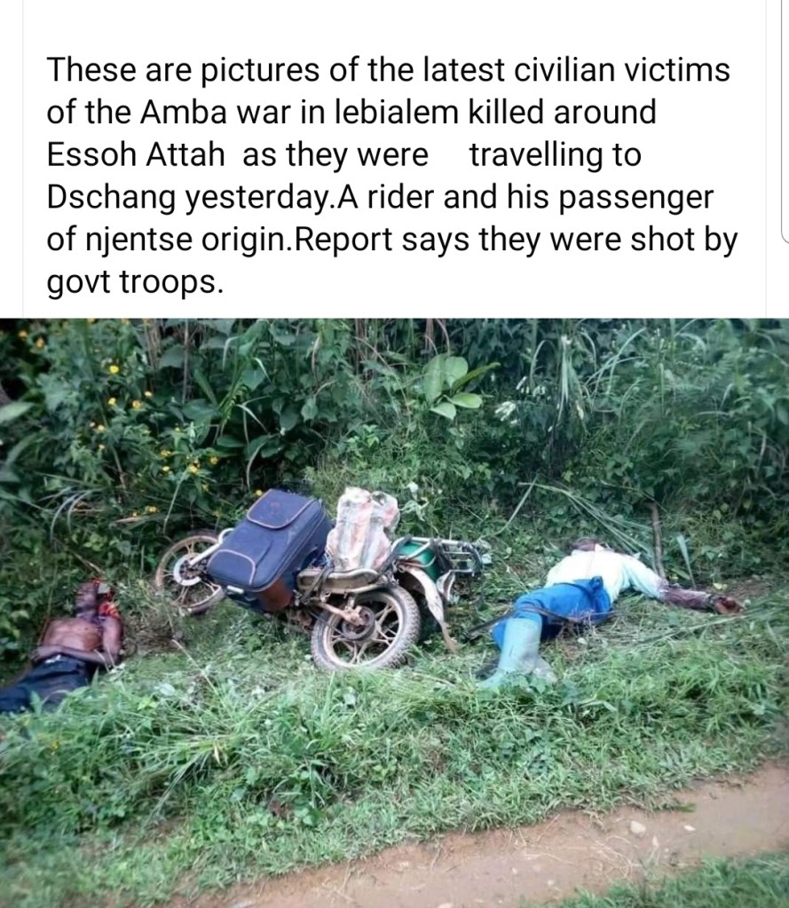 On the day three diplomats deceived the global community that they were meeting King Biya at his palace in Yaounde for a solution to the Genocide that has claimed more than 16,000 lives, the French Cameroun Bulubeti militias were upping up their killing game. As the champagne glasses were clinking in Yaounde on the 27 of December, 2019, at least 5 innocent farmers were executed point blank in the farming community of Muea, Southern Zone of British Cameroon by French Cameroun’s appointed Administrator and ICC prospect Okalia Bilai. These farmers were caught on their way to their farms. The lifeless bodies could be seen with their farming tools like machetes. (Read more here). In British Cameroon, it is but normal for anybody to be termed a terrorist, and executed by the French Cameroun soldiers, now seen as occupiers by the population. In Lebialem, scores have been killed as the military is on a night vigil in the community. pictures of killed victims include an innocent bike rider executed alongside his passenger on their way to Dschang, a nearby French Cameroun town. The luggage he was transporting is one more evidence of the Crimes Against Humanity being committed in the British Cameroons.