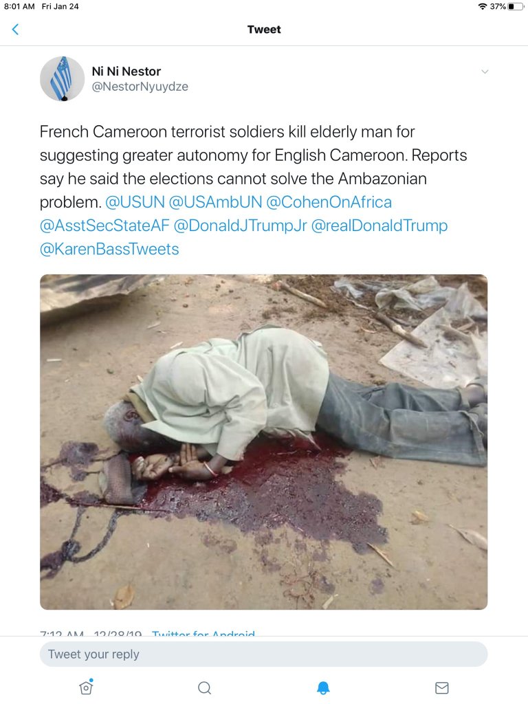 The U.S has spoken through its Ambassador to the UN Kelly Craft and that for Africa, Mr. Tibor Nagy. Both have stressed the need for an inclusive dialogue citing the Swiss Initiative as vital. Both the Netherlands and Belgian Ambassadors to the UN have echoed same route to peace. The U.S Congress has equally voiced support for a negotiated settlement. From the renewed and intense burning and killing of the English-speaking minority by the French Camroun majority under Paul Biya and backed by France, these words are proving to be hogwash. The Atrocity Crimes on the colonized people of the British Cameroons has continued unabated. Former excuses like, “we were unaware of the gravity” of the situation as did former diplomats on Rwanda in 1994 have been quashed by social media that has enabled an instant serving of these happenings on the menu tables of these power-brokers. A content analysis of tweeter tags to Ambassador Tibor Nagy, Rep. Karen Bass and Ambassador Kelly Craft, show that these personalities receive a minimum daily tag of British Cameroon issues of about 30. This is enough to lure these powerful personalities to muster the courage and do the right thing of STOPPING THE GENOCIDE by forcing French Cameroon to the table and to initiate a fact-finding mission. Mr. Tibor Nagy has been categorical that, a military solution is unattainable. He has however shied away from any action to help stop the killing and burning, unheard of in the 21st century. His many tools in his tool box are still untested.