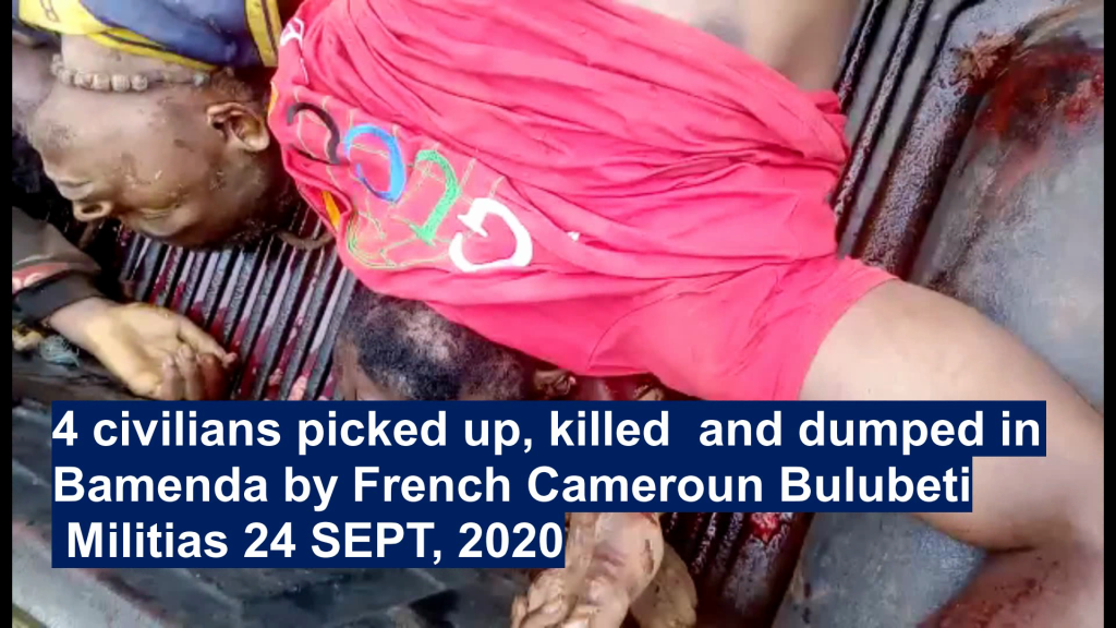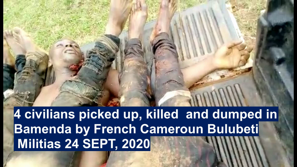 Four Innocent youths picked up, killed and dumped by a river in Bamenda 24 September, 2020: The four were just minding their business as the narrator of the video explains when French Cameroun soldiers arrested/kidnapped them. The next day, their bodies were found near a river. (Video below)